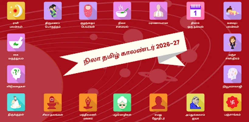 Nila Tamil Calendar manhaja ce ga al'ummar Tamil a duniya. Tana dauke da kalandar 2025 zuwa 2030, da lambobi, da dacewar aure, da sunayen jarirai, da kuma shawarwarin kyau. Manhajar Nila Tamil Calendar kyauta ce kuma tana aiki ba tare da intanet ba.