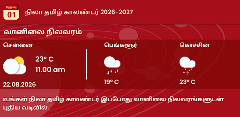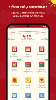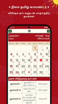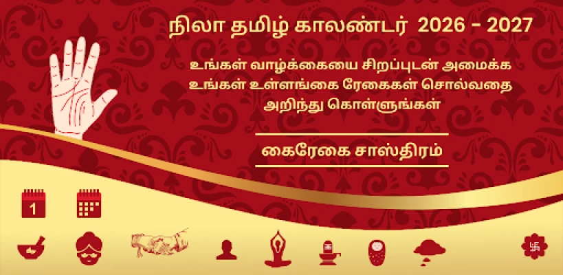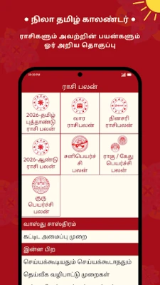 Shafin kalandar yau da kullum na *Nila Tamil Calendar 2026* yana nuna ranaku na Tamil (tare da shekarun Thiruvalluvar), ranaku na Musulunci, hasashen Rasi na kowace rana ga taurarin horoscope guda 12, da kuma bayanan Panchangam masu albarka. Har ila yau, shafin wata-wata yana ba da bayani game da ranaku na hutu na gwamnatin Tamil Nadu, ranaku masu kyau don aure (Muhurtham), ranakun azumi kamar Amavasai da Pournami, da kuma ranakun Kari, duk bisa ga Hindu da Tamil Panchangam. Don ƙarin haske a rayuwarka, ana samun bayanan Guru Peyarchi daga 2025 zuwa 2030 da hasashen shekara ta 2025, waɗanda ƙwararrun masana taurari suka shirya, tare da yiwuwar tuntuɓar su don fahimta. Haka kuma akwai sabis na daidaita aure da ilimin lambobi don taimakawa wajen yanke shawara mai mahimmanci.