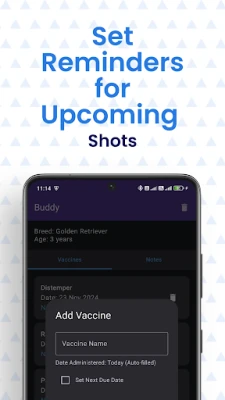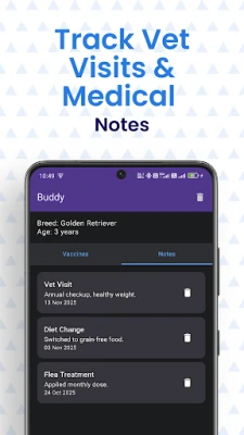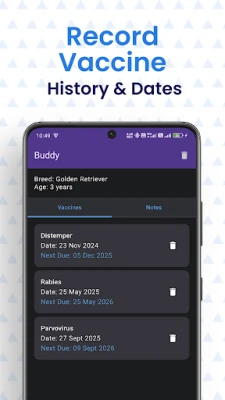 Pet Vaccine Tracker yana kawo maka fasali masu yawa da aka tsara don biyan buƙatun masu dabbobi. Zaka iya ƙara dabbobi marasa iyaka, kowane ɗaya da sunansa, shekarunsa, jinsinsa, har ma da hotonsa don cikakken bayani. Manhajar tana ba ka damar yin rikodin cikakken tarihin alluran riga-kafi da sauran bayanan likita. Saita tunatarwa don ranakun allurai masu zuwa don tabbatar da cewa babu wani abin da zai kubuce maka. Haka kuma, zaka iya ƙara bayanai na musamman game da ziyarar likita, magunguna, da binciken lafiya, duk a wuri ɗaya mai tsabta kuma mai sauƙi don amfani.