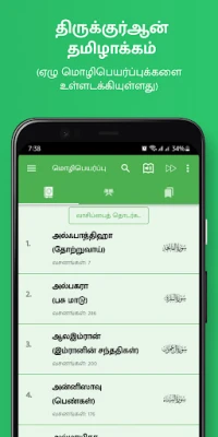 Don tabbatar da cewa kowane mai karatu ya sami fassarar da ta fi dacewa da shi, Tamil Quran yana ba da damar zaɓar daga cikin manyan fassarorin Tamil guda bakwai. Waɗannan sun haɗa da fitattun sunaye kamar John Trust, P. Jainul Aabdeen (tare da Thafseer), Islamic Foundation Trust, King Fahd Quran Complex, Abdul Hameed Baqavi, Tamilnadu Thowheed Jama'ath (tare da Thafseer), da kuma Omar Sherif Qasimi. Haka kuma, manhajar tana ba ka damar tsara yadda kake karantawa ta hanyar zaɓin kyawawan nau'ikan rubutun Larabci da na Tamil, har ma da daidaita girman rubutun domin tabbatar da cewa ka sami cikakken kwanciyar hankali yayin karatunka, yana mai sa kowane shafi ya zama mai daɗi da kuma sauƙin karantawa.