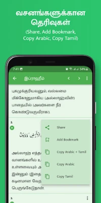 Bincike da kewayawa cikin Kur'ani ya zama mai sauƙi tare da Tamil Quran. Ko kana neman wata ayar musamman ne ko kuma kana so ka bincika wani taken addini, aikin bincike mai ci gaba yana ba ka damar samun abin da kake buƙata cikin hanzari. Haka kuma, zaka iya shiga wata ayar kai tsaye ta hanyar shigar da sura da lambar ayar. Kuma idan kana son raba ilimin da aka samu daga Kur'ani, manhajar tana ba da sauƙin raba ayoyin Kur'ani masu jan hankali tare da masoyanka ta hanyoyin rabawa daban-daban da ke kan wayarka, yana yada albarkar Kalmar Allah ga sauran mutane. An tsara Tamil Quran don saukakawa kowa yayi amfani da shi, ba tare da la'akari da matakin ilimin addininsu ba.